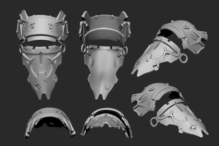 Особенно интересным оказался элемент брони на голове. Он выполнен из нескольких частей для удобства печати. Я предусмотрел посадочные места и пазы для точного позиционирования, а также сделал выборки под ленточки, чтобы все детали прилегали максимально плотно.