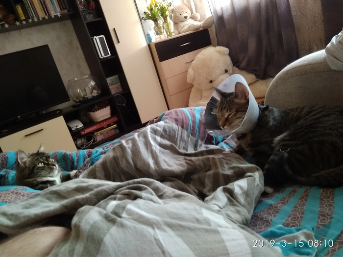 Первое его приключение было, когда он сиганул с 4 этажа. Ничего, девахи его отловили, жив и здоров. Но то ли это, то ли прыжок со шкафа на горшок вызвало у него отёк лёгких и поехал он в кошачью реанимацию. Пришлось девушке занимать на его лечение приличную сумму. Очухался. Я уже вернулся из армии, болтаюсь на вышке на работе, звонок. Девушка орёт, визжит, плачет. "Этот дебил мне палец с ногтём насквозь на руке прокусил, а сзади кошка-его подруга Матильда на спине висит-когтями вцепилась. Оказалось, что этот дурак запутался в ручке от чемодана на колёсах и закрутился там, пока девушка пыталась ножницами отрезать эту лямку, ей и досталось. Фигня. Дальше больше. К нам приехали друзья, сидим на кухне в настолки рубимся. Вдруг звон, очень громкий звук битого стекла. Коты наши бесились и смахнули с подоконника временно стоявшее там огромное тяжеленное зеркало. И попрятались. Ну ладно бывает, пошел за веником включил свет. Подметаю осколки. Кусок шерсти, кровь. Таааак. Ищем котов. Осматриваем. Вроде всё впорядке. Вдруг девушка кричит: " Ааа, он себе хвост отрубил!" Ну, как хвост. Кончик в сантиметра 4. В тот день мы в настолки не доиграли. Операция по удалению висящего обрубка, лечение. Ну окей, ничего страшного. Это просто хвост. Был кот у знакомых в деревне, так его машина сбила, думали помер, закопали на метр, а он вылез. Так всё в жизни просто не бывает и у Юджина на фоне стресса вскакивает огромный лишай на хребтине и плюс обостряются, хрен пойми откуда взявшиеся ушные клещи. Лечение, помазюкания, уколы, таблетки.