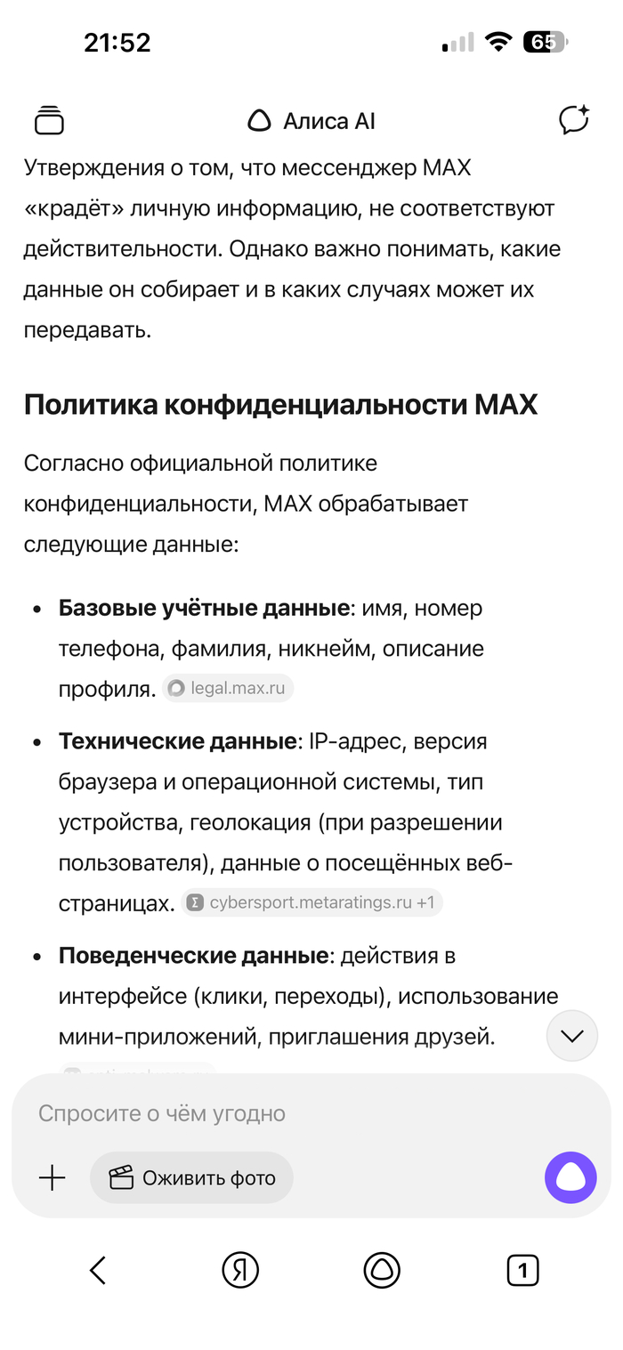 [моё] Яндекс Алиса Мессенджер MAX Текст