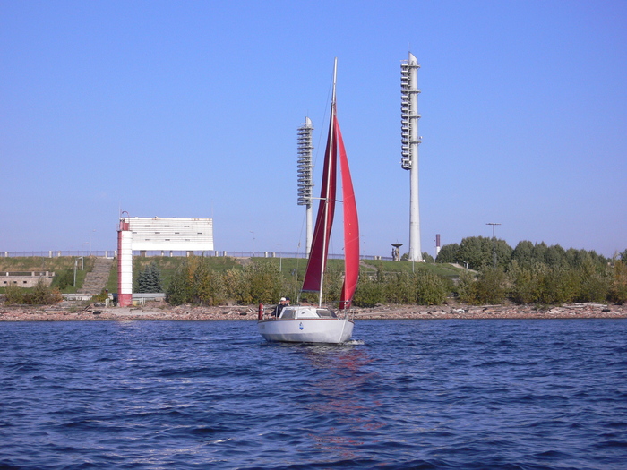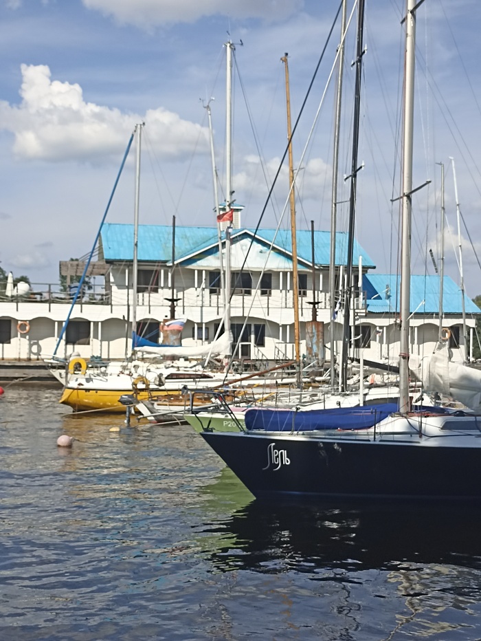 Впереди возвышалось здание ресторана, стоявшего на воде, обогнув которое я увидел нужный мне яхт-клуб "Чебоксары". Пока искал место для швартовки, на одном из пирсов показался мужчина, с которым, как выяснилось, я вчера и созванивался. Поразмыслив, он указал мне на низкий мостик, соединявший пирсы с набережной, и я, подойдя вплотную, выбрался на него.
