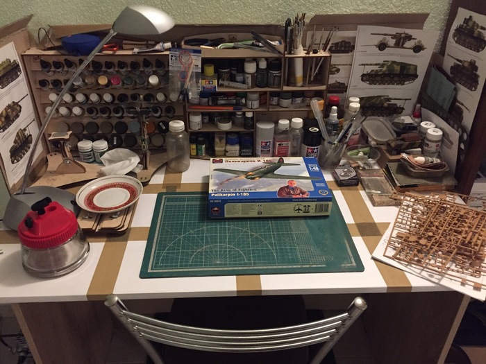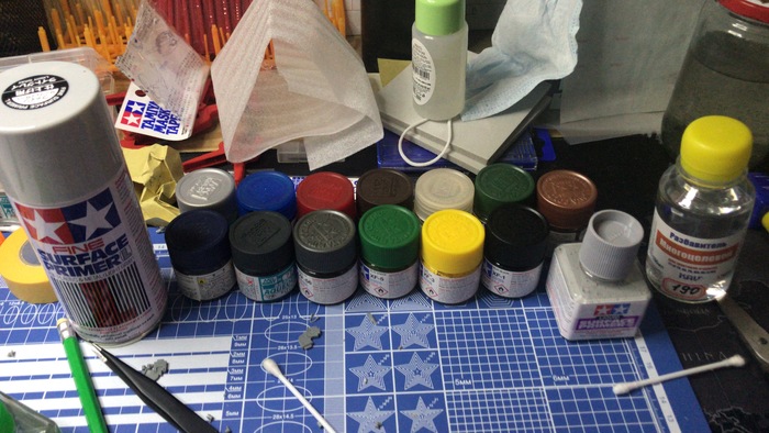 Всего я нанёс два слоя грунта, опасаясь, что большее похерит всю расшивку (маленькие имитации заклёпочек и всё такое). Для верности выждал сутки, а тем временем навел на столе подобие порядка и провёл ревизию лакокрасочных средств. В процессе всей предыдущей сборки я пару раз гонял в магазин, докупая недостающие цвета, поэтому надо было всё прикинуть и посмотреть, что у меня есть, а чего нет.