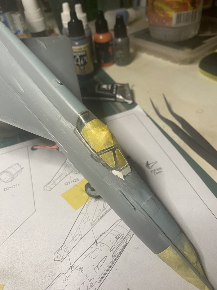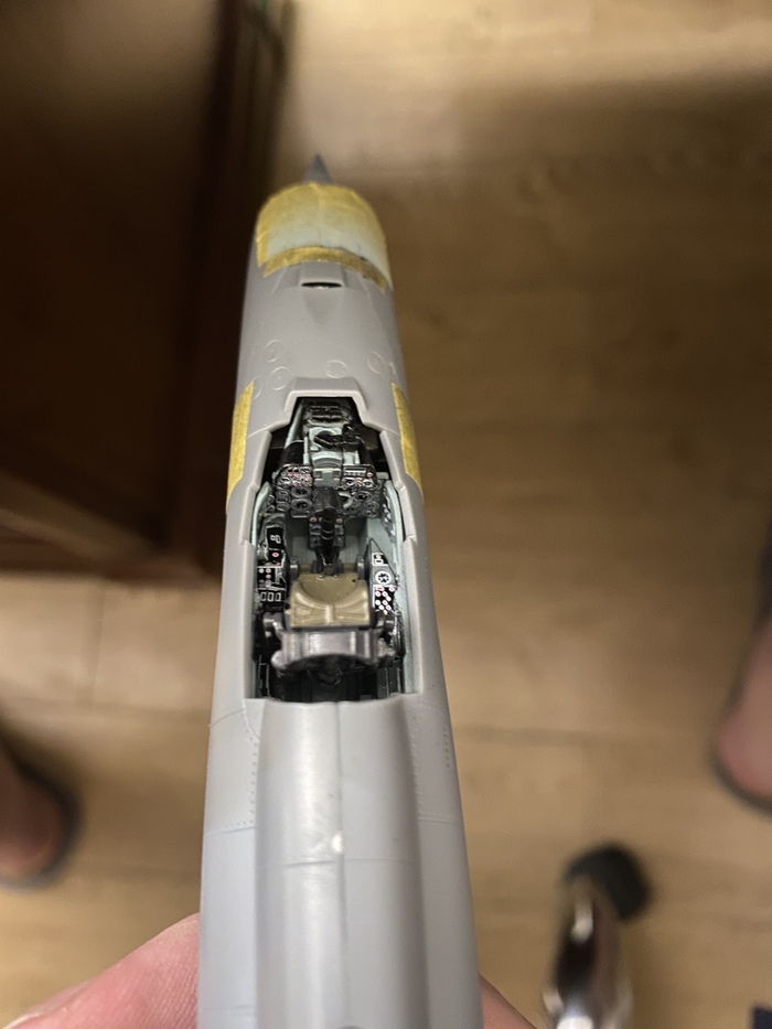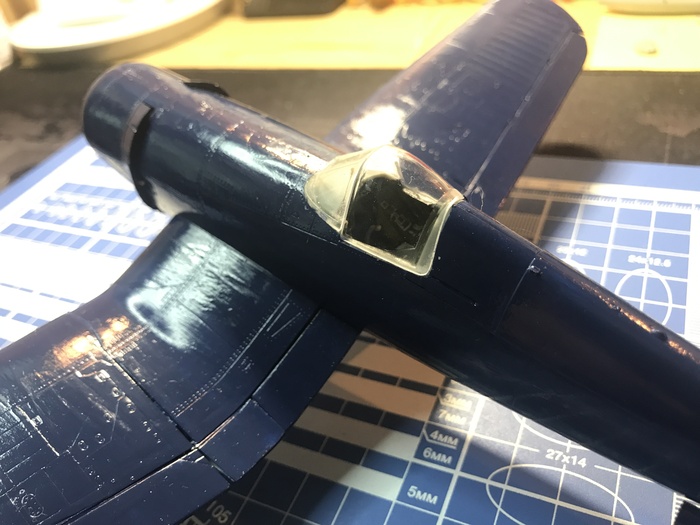 С самой большой клетчатой декалью тоже не обошлось без возни. Носовая часть фюзеляжа имеет форму усечённого конуса, а не цилиндра, как может показаться на первый взгляд, поэтому я пытался расположить её ровно до тех пор, пока не порвал. К счастью, удалось практически незаметно состыковать половинки.