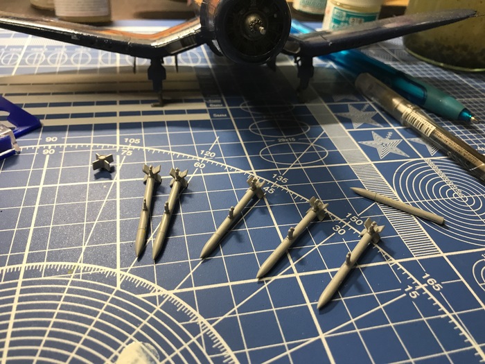 Пока самолётик сох, можно было заняться сборкой ракет, каждая из которых состояла из одной более или менее большой и трёх маленьких деталей. Как оказалось они вполне неплохо держатся и без клея, поэтому я пришёл к тактике сначала собирать, а потом уже заливать в места стыков клей с кисточки.