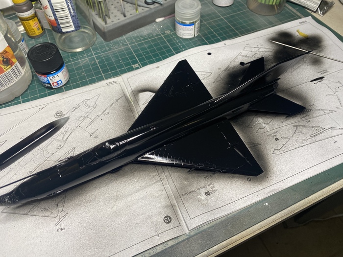 А вот с покраской этих ракет вышла отдельная история. Во-первых, покрывать грунтовкой детали на литниках было достаточно плохой идеей — их надо было сначала собрать, а потом прогрунтовать кисточкой, потому что они стали плохо клеиться. Во-вторых, полный факап вышел с белой краской. Я пользовался белой Mr. Color (или Mr. Hobby), но она категорически отказывалась нормально ложиться на грунтовку. Сколь аккуратно я бы ни старался покрыть поверхность, она либо собиралась толстыми слоями в одних местах, полностью оголяя другие, либо ложилась вообще прозрачным слоем. Я до посинения тряс баночкой, думая что проблема в неоднородности, но это не помогало. Тогда я плюнул и съездил в магазин за краской от Tamya. Результат был тем же. Почти отчаявшись, я вспомнил, что в армии ракеты были вообще полностью зелёными и никто не жаловался, поэтому решил покрасить всё на свой вкус. Так, я оставил носы хаки, а сами корпуса выкрасил в чёрный, который идеально ложился и вообще оставлял после себя только положительные эмоции.