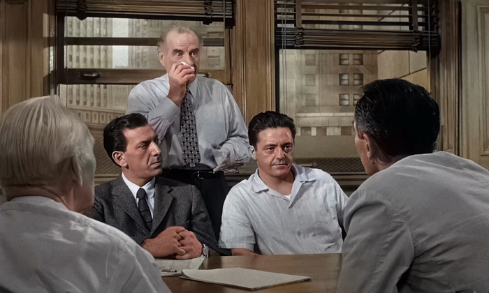 О фильме: 1956 год. В США заканчивается эпоха маккартизма, еще сильна расовая сегрегация, а на экраны выходит скромная (всего $349 тысяч) судебная драма, снятая в одной комнате. В фильм не закладывалось то, что мы видим сейчас, Реджинальд Роуз (сценарист), изначально писавший пьесу для театра всего лишь описывал свой опыт по участию в судебном процессе. Но я не случайно вспомнил маккартизм и сегрегацию, представьте себе, как было разделено общество в США в то время, охота на «коммунистов и их приспешников», чёрные и белые, и да, вечные богатые и бедные. Большинство людей в таком обществе с лёгкостью зрителя гладиаторских боёв судило любого человека, достаточно было кому-то указать на этого человека и сказать «он – коммунист», белые винили чёрных и наоборот, бедные винили во всех своих бедах богатых, а богатые презирали бедных. Фильм так и начинается, одиннадцать присяжных готовы отправить подростка на электрический стул потому, что «суд всё доказал» и «что тут думать, голосуем и закончим с этим». Но решение нужно принять единогласно и один, проголосовавший против, переворачивает взгляд остальных присяжных и зрителей. Фильм снят в одной комнате, но это не спектакль. Напряжение, возникающее в комнате, подчеркивается великолепной операторской работой и ритмом самого фильма. Сценарий, проработанный до мелочей, не провисает, а только выкручивает напряжение до самого конца фильма. Актёрам не просто веришь, а начинаешь понимать их героев. Именно понимать, понимать их мотивации и мысли. После просмотра становится понятно почему этот фильм до сих пор изучают на юридических факультетах и курсах по работе в группе. Это настоящий гимн презумции невиновности, критическому мышлению и логике.