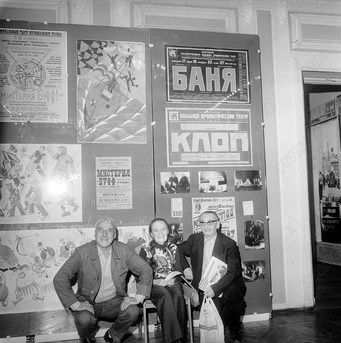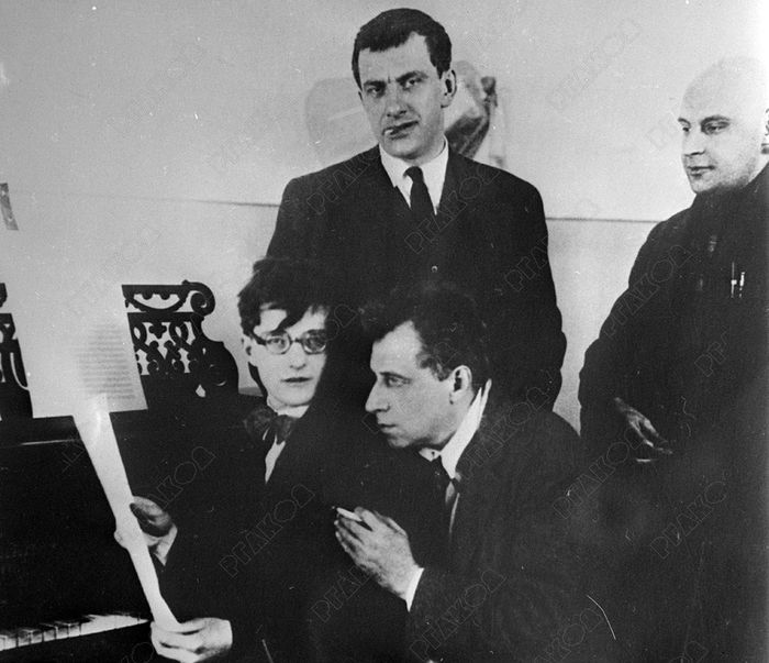 В.В. Маяковский, Д.Д. Шостакович, В.Э. Мейерхольд, А.М. Родченко в Государственном театре имени Вс. Мейерхольда в период репетиции спектакля «Клоп»