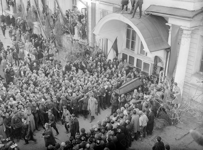 Вынос гроба с телом В.В. Маяковского из клуба Федерации писателей. Гроб несут: А.Б. Халатов, А.А. Фадеев и другие