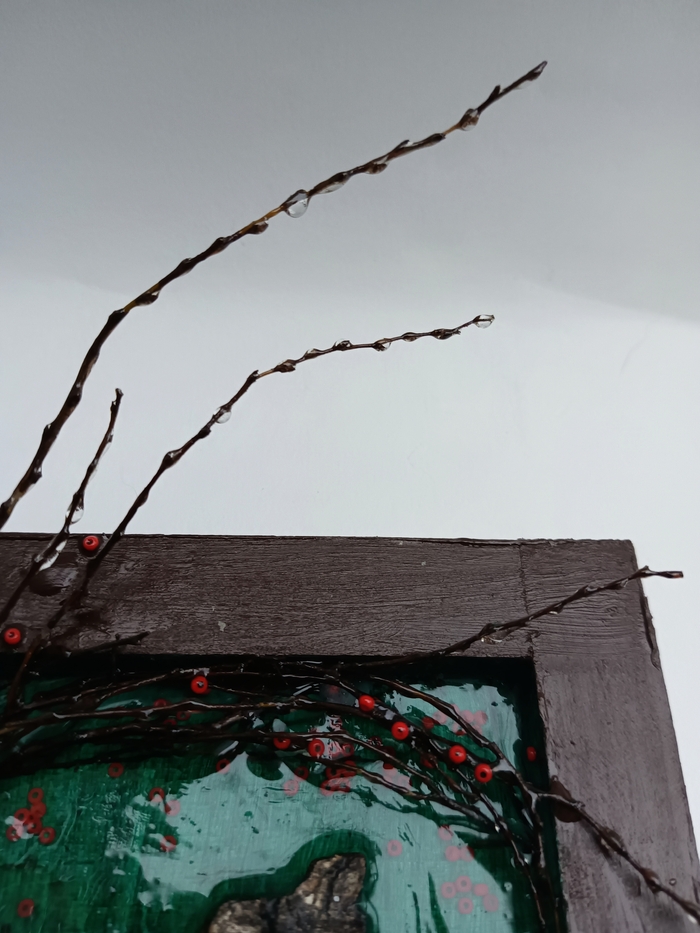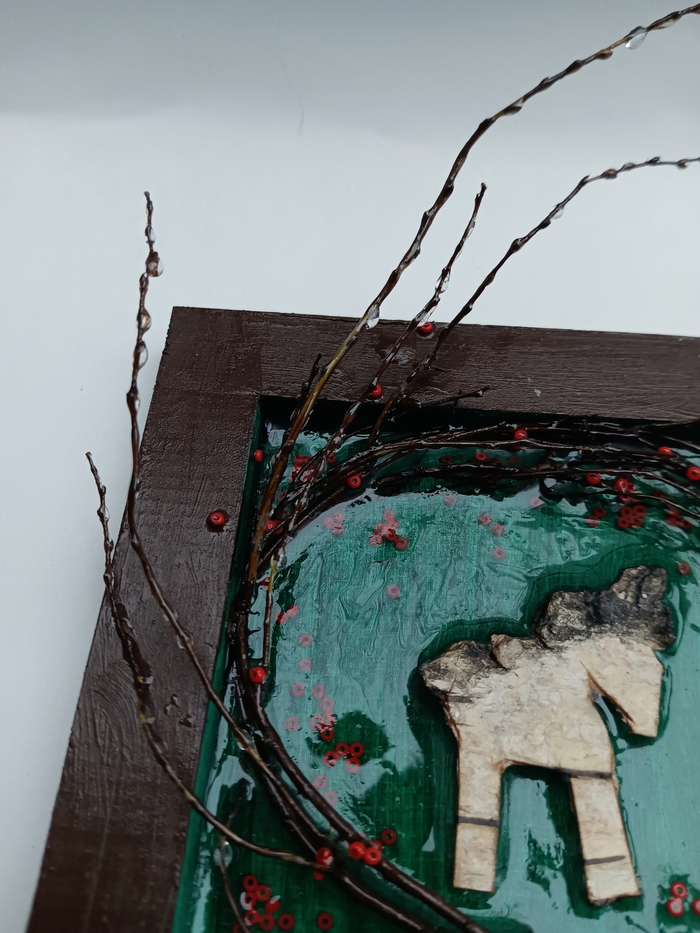 13х13 см, деревянный планшет (береза), веточки, бисер, лошадка из бересты