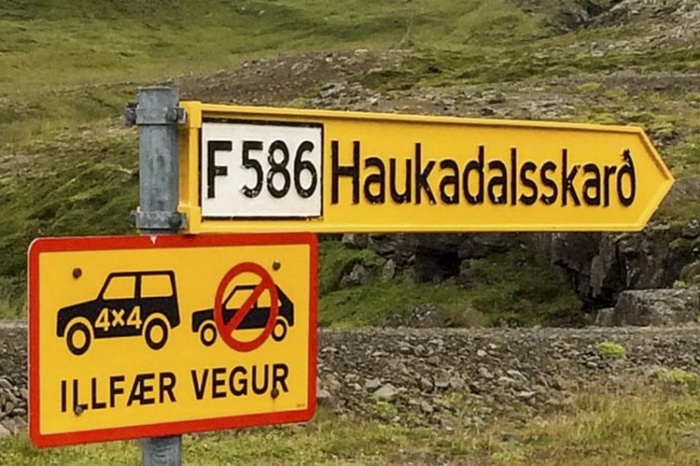 * Расположенные в центре страны на высоте более 400-500 метров над уровнем моря, эти горные территории не пригодны для жизни. Путешествовать по горным дорогам Исландии, обозначенным как F-дороги можно только на полноприводном автомобиле. Об этом вас предупредит знак на въезде на такую дорогу.