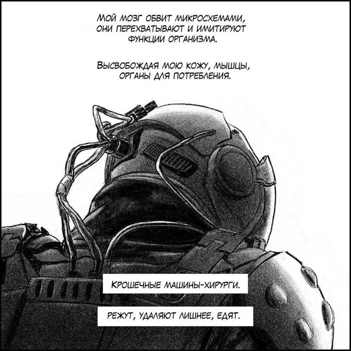 Он больше не кашлял. Дышал ровно. Но дышал, как ему казалось, не легкими. Воздух шёл прямо в кровь, через какую-то мембрану «Вепря». Последние дни он существовал в состоянии странной ясности. Он не чувствовал тела. Его не было. Была только мысль, парящая в красноватом мраке визора, и голос «Вепря», тихий, как эхо: