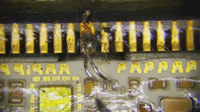 Частично тонкие золотистые проводники конечно сохранились. Те что были полностью покрыты защитным герметиком.
