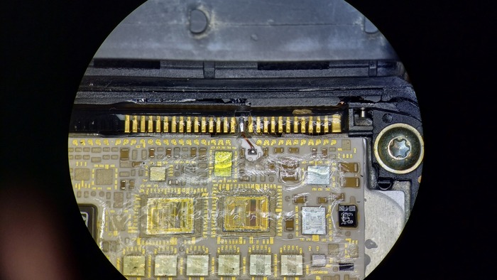 Паяная контактная площадка из группы датчиков колёс полностью испарилась. Не удивительно, ведь гель в этой области заметно помутнел, а значит температуры там были огромными, свыше 400 градусов. Явно поработали паяльником на максимально доступной температуре. Более того, "мастера" попытались расковырять керамику чтобы добраться до переходного контакта. Так что контактная площадка теперь убита с корнем, припаяться некуда.