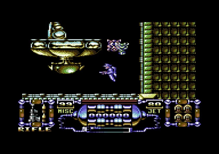 Канистры с топливом разбросаны по пяти уровням корабля, до которых Дэн может добраться с помощью телепортов Мекона. Однако, чтобы добраться до них, Дэну нужно уничтожить любого инопланетного упыря, который встанет у него на пути, используя различное оружие, купленное с помощью компьютерного терминала. По пути лидера меконов можно увидеть сидящим без дела, и его уничтожение чаще всего вознаграждает Дэна капсулой, которая ему нужна для доступа к телепорту. Дэн может использовать свой реактивный ранец для навигации по спутнику, но в конечном итоге у него закончится топливо. Графически игра не плоха, но в силу того что ранее я не был знаком ни с серией ни в принципе с играми на с64 мне было нихрена не понятно куда идти. Немного полетав на джетпаке я понял что есть телепорты которые проходятся попаданием в квадраты которые появляются в безганичном космосе. Долго не играл, но игра выглядит достаточно приятно.