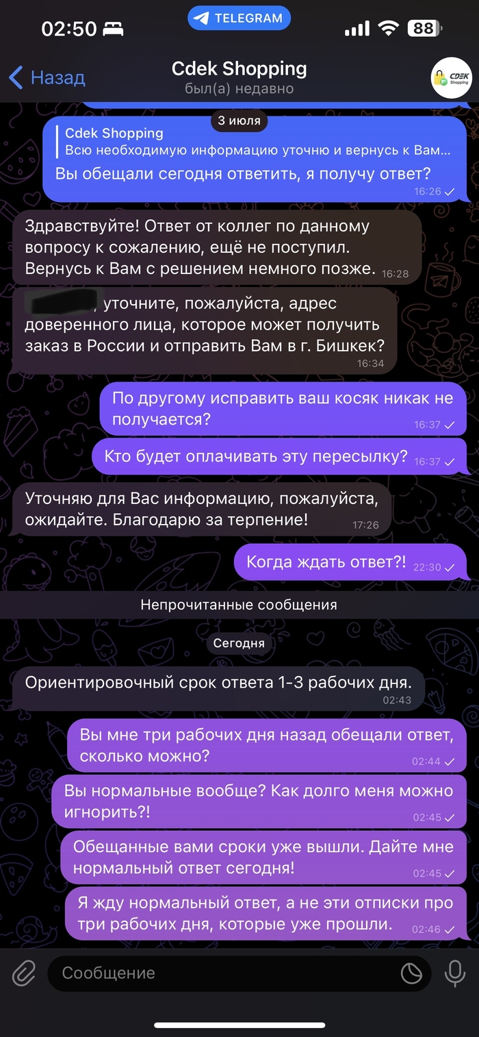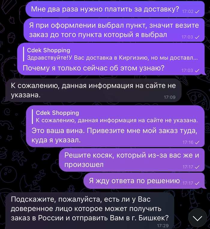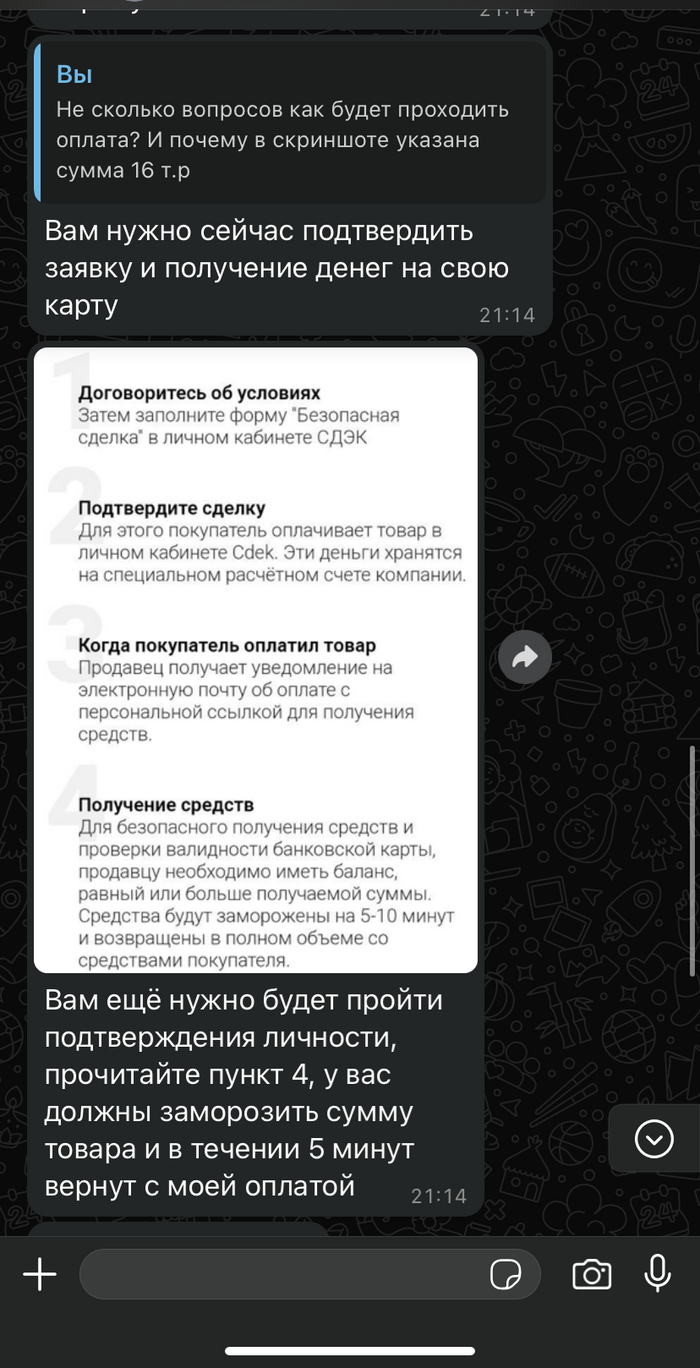 И так, все началось с того, что я начал искать задние крылья на автомобиль, так как на моем свежепреобретенном японце они пострадали в результате дтп. На всяких площадках профильных площадках, за дорого я всегда успею купить, но решил поискать в группах месенджеров, там часто есть люди которые разбирают машины. В одной из групп с 10000+ подписчиков в барахолке, откликнулся человек, который сказал что у него есть два крыла и даже бампер и как на зло для меня в белом цвете, что практически в цвет. Попросил фото, на следующий день прислали фотки крыльев все огонь. Почему меня это не сильно насторожило я не знаю, но продавец упопрорно настаивал на отправке СДЭКом ( это ключевой момент в разводе). Типо у него есть договор со сдэком, поэтому несмотря на объем доставка выйдет не дорого. Схема оплаты следующая, он запоковывает детали, создает накладную и отправляет тебе, ты проверяешь если все подходит, то переводишь деньги за запчасти и он отправляет, звучит вроде все логично и безопасно. Я получил накладную, так как я завел себе давно тоже СДЭК ID то мне сразу пришло уведомление, что на мое имя ЗАРЕГЕСТРИРОВАН груз, оплата за доставку столько то.Переводим деньги, вроде все ровно, что она успешно и делает. Деньги ушли и мы торжественно ждали когда груз пойдет на отправку. Попутно общаясь с продавцом и уточняю точно ли отправили груз и так далее, продавец утверждает что да, все выслали ждите. Мы ждали, на утро следующего дня, решил написать в СДЭК и уточнить передали ли груз, потому что у меня все еще висит ЗАРЕГИСТРИРОВАН, на что представитель тех поддержки сказал, что статус смениться в течении 12 часов, после отправки, я переписал данные акта СДЭК указал, что груз приняли на отправку еще вчера днем, приняла такая то в такое то время. Через какое то время мне ответили, что отправили вопрос какому то другому человеку, он свяжется с работником СДЭКа и уточнит статус груза, ответ ждите через 2 суток, что меня конечно сильно не устраивало. Решили поступить радикально и позвонили сами в пункт приема. Оказалось что человек уже не первый раз создает накладные, указывая адрес данного пункта, но товар ниразу не приносил на отправку, тут стало ясно что нас развели. В итоге мы имеем, через СДЭК который никак не реагирует на регулярные созданые накладные, по которым никогда ничего не отправляют, мошейники получают деньги, перевод в нашем случае ушли какой то девушке, которые якобы не вкурсе что это за деньги, но и возвращать не собирается, якобы эти деньги ей перевели за электронную валюту ( почему то всегда только девушки продают биток, знаю про случай развода такой же с авито, человек так двигатель "купил"). Так что если вам предлагают какой то товар с отпракой через СДЭК тщательно все проверяйте, а лучше пользуйтесь наложкой, обычно при предложении отправить товар наложным платежомю мошейники сливаются, но я об этом узнал только потом. Ситуация эта случилась буквально сегодня, поэтому пока никаких действий не предпринято, так как думаем что как и куда подавать. спасибо за внимание, извините за сумбур. если что то не понятно, но очень интересно, спросите я отвечу попонятнее.