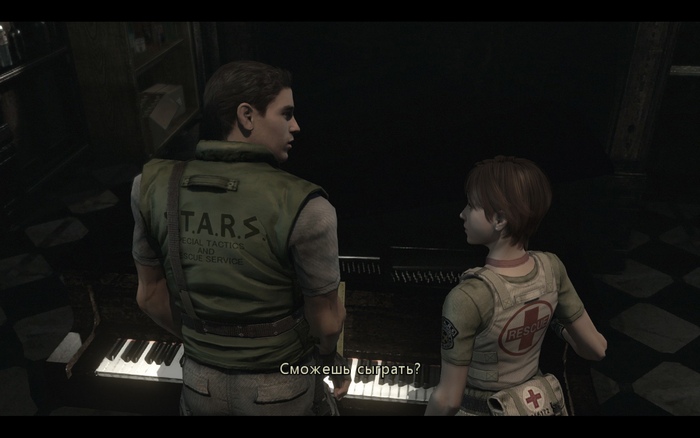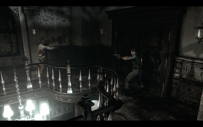Сюжет в игре практически не изменился, у нас на выбор так же два персонажа (Джил и Крис), прохождение за которых отличается небольшими деталями и сюжетными роликами, загадки практически одинаковы. У Джил в инвентаре, с самого начала есть отмычка, а у Криса зажигалка, от этого изменяется порядок прохождения комнат и использования предметов, так что реиграбельность всё же присутствует. Я прошел игру за обоих героев, и второй раз играть было не менее интересно, хотя и проще. Так же различается и стиль прохождения, в зависимости от персонажа. Крис силен, у него много здоровья, но очень маленький инвентарь, приходится больше бегать и уворачиваться, так как если положить туда парочку сюжетных предметов, на тяжелое оружие и лечилки места уже нет. В карманах у Джил места много хватит и на гранатомёт, и на травку, и хотя она и помирает от пары укусов, за нее мне игралось легче. Еще одно нововведение – оружие последнего шанса. Когда зомби нас хватает, можно воткнуть в него нож или ударить электрошокером, зомбарь не умрет, но нас в покое оставит, на некоторое время. Орудие одноразовое, но можно носить несколько штук сразу. Попадается оно не так уж и часто, место в инвентаре не занимает, и является альтернативой уклонений из третьей части.