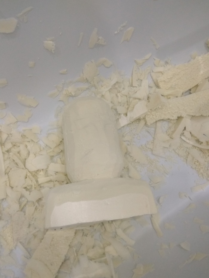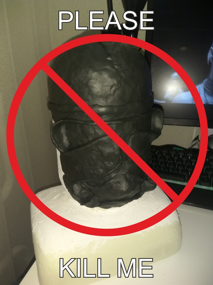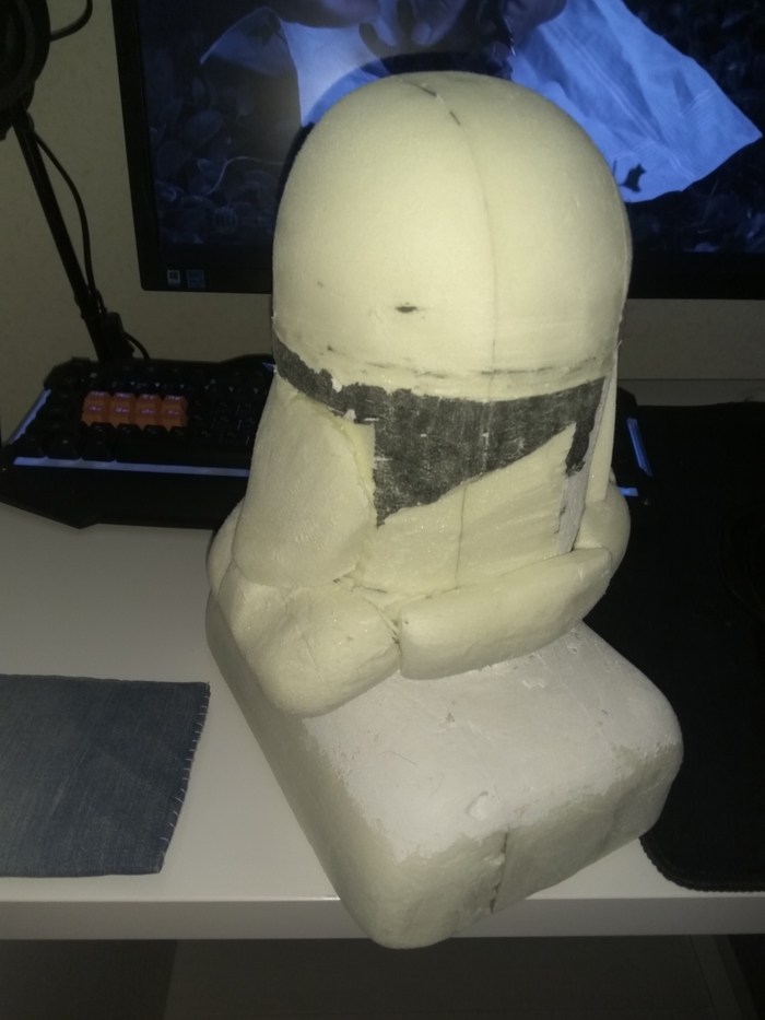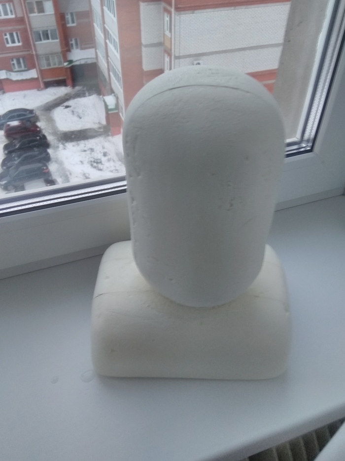 После похода в магазины, были закуплены краски акриловые, грунтовка, клей и пластилин скульптурный. Склеил три листа пеноплекса, который потом сточил ножом и шкуркой до некоего подобия головы (час с лишним пром*дохавшись с этим делом в ванной)