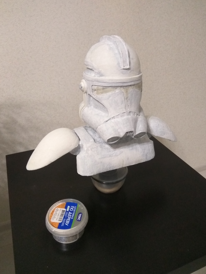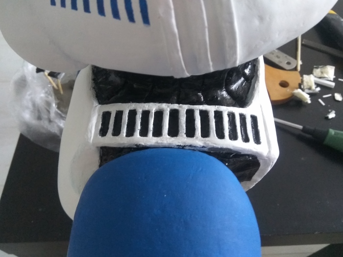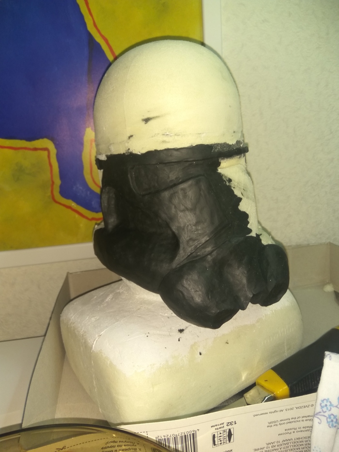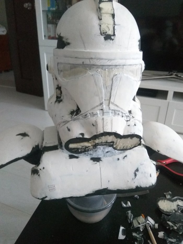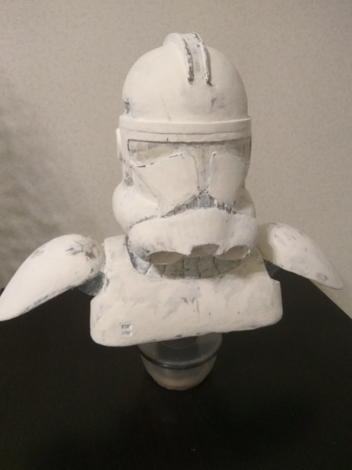 Вроде бы что-то начало вырисовываться, чему я был несказанно рад! Наушники сперва пытался вылепить, потом из того же полистирола сделать - в итоге выточил из пластика. Вырезал визор из тонкого прозрачного пластика и покрасил с обратной стороны черной краской. Далее были вырезаны наплечники, фоток процесса не осталось.