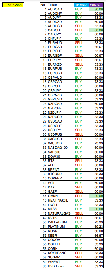 Весь перечень анализируемых активов указан ниже в общем количестве 60 инструментов. Здесь Вы найдете активы рынка Форекс, популярные активы Московской биржи, не менее популярные активы Чикагской биржи СМЕ и мажор криптовалютного сегмента - Биткоин, за которым следуют все альткоины.