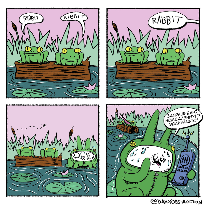 //Люгушки квакают, а кролик в костюме лягушки говорит "кролик". На чём и палится.