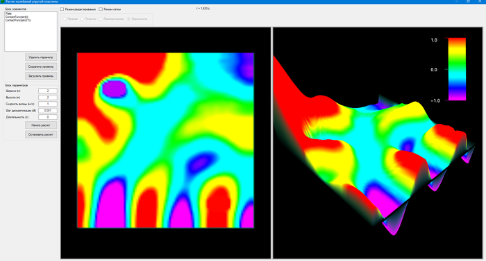 В итоге пластина 1024*1024. Уже детальнее видно волны. Любое количество источников колебаний, барьеров или закреплений пластины. И также любые параметры функций колебания и профилей контакта.