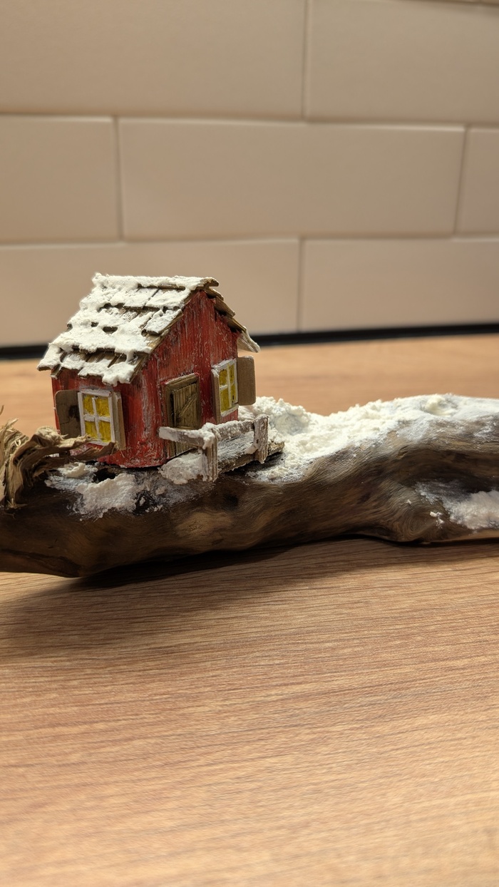 Дальше выпилил домик, все простенько. Крыша из шпона от фанеры. Прикинул по местоположению на коряге.