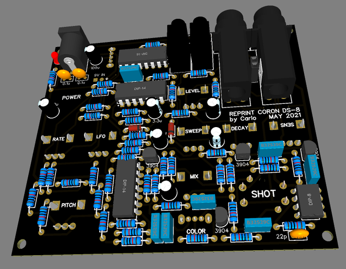 Места для такой небольшой схемы было достаточно, поэтому дилей оброс LFO генератором для модуляции, а на оставшемся месте была реализована макетная плата (кстати не зря, так как в первой версии оказались ошибки и это дало возможность их исправления)