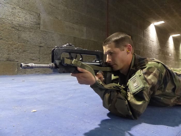 В1: Стрельба, чтобы привыкнуть к шуму и отдаче оружия. Позиция лежа с сошками. Ростовая мишень 25м. С 2018-года также практикуется стрельба полной очередью из позиции стоя и/или с отсечкой по 3 (FAMAS) по мишени на 25м, чтобы было ясно, что это такое.