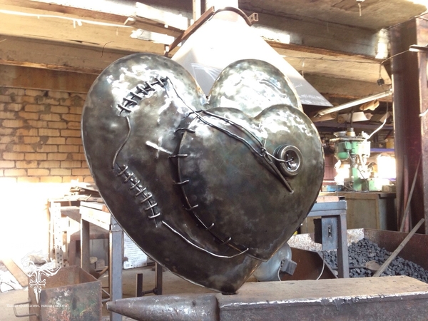 Металлическая экспозиция «Два сердца сшитые друг к другу». Был сделан как домашняя работа на 11-й Бывалинский фестиваль кузнечного искусства.