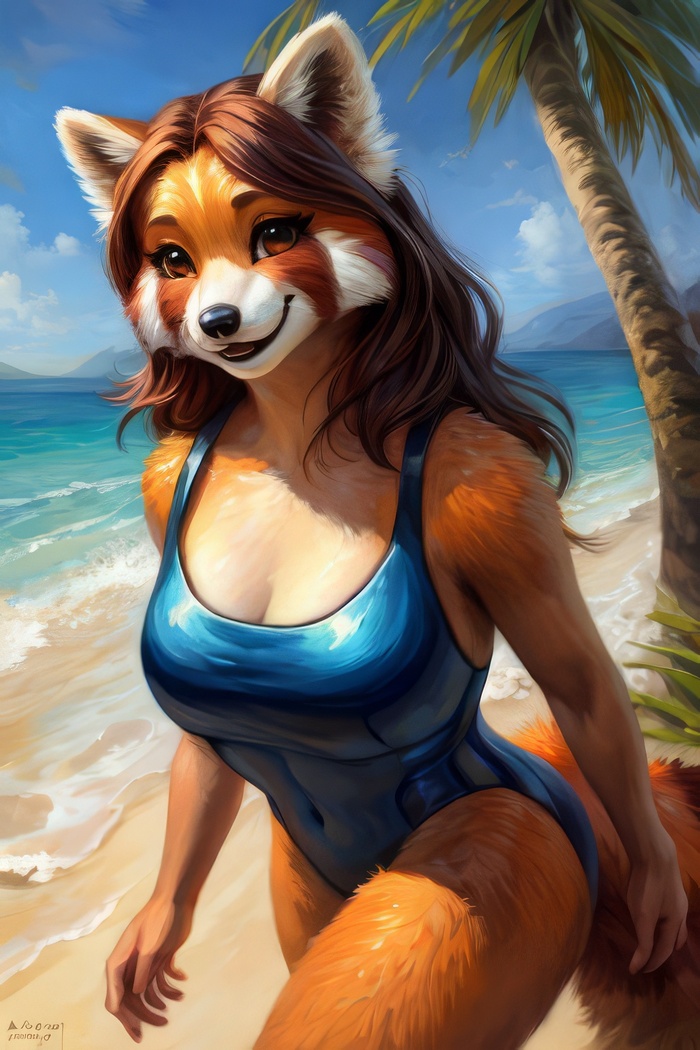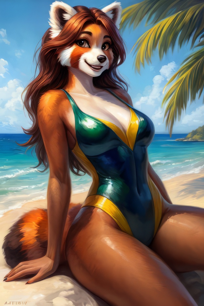 [моё] Арты нейросетей Арт Фурри Furry Art Furry Red Panda Пляж Купальник Море Бикини Обои на телефон Длиннопост