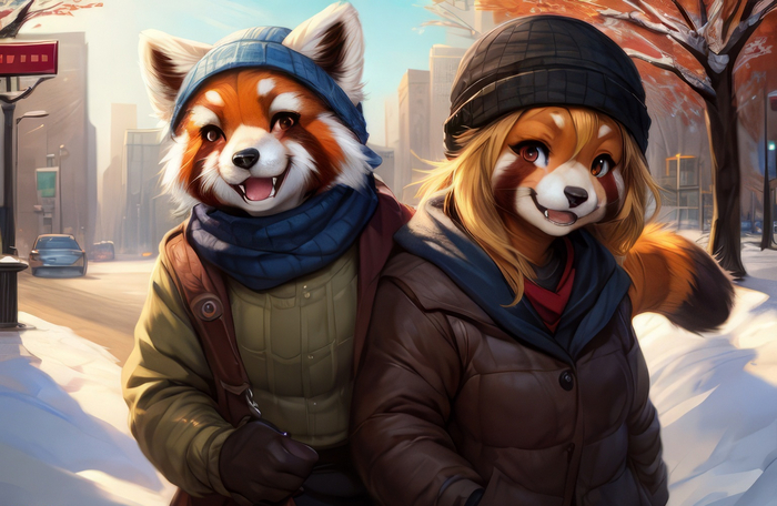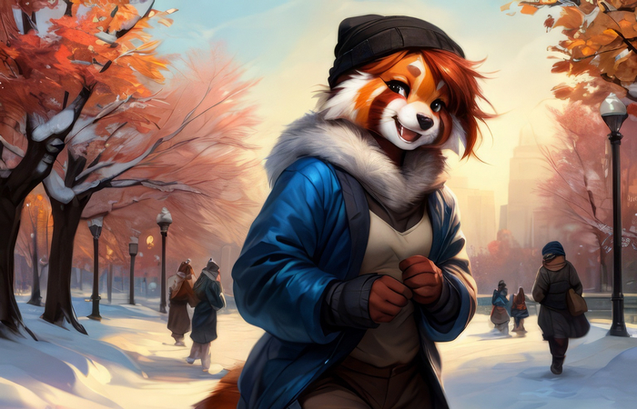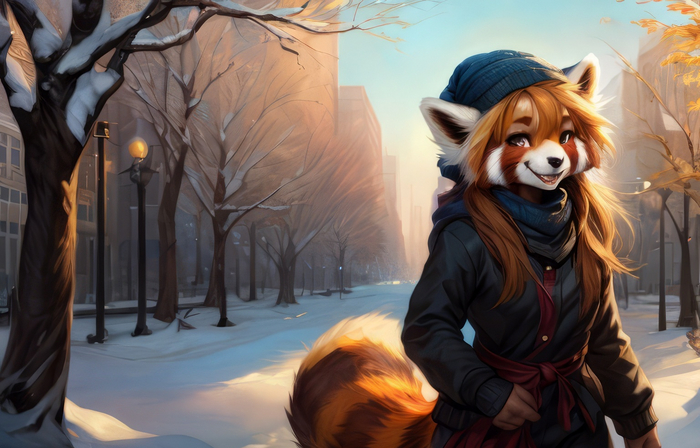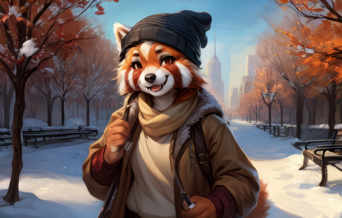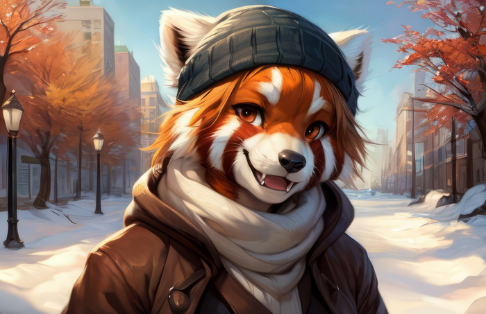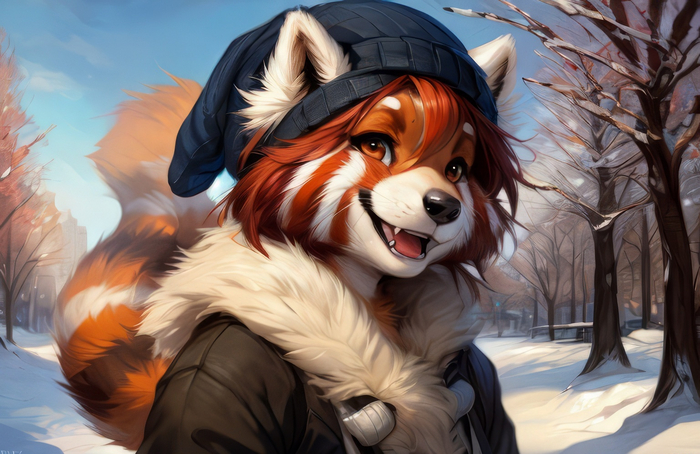 [моё] Фурри Furry Art Арты нейросетей Арт Furry Red Panda Зима Снег Зимняя одежда Обои Обои на рабочий стол Длиннопост