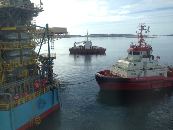 2. Буксиры цепляются к вышке с 4х сторон, и начинается закачка балласта, судно погружается а груз остаётся на плаву.