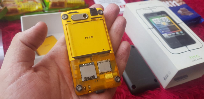 Разборка начинается с снятия задней крышки и выкручивания шести винтиков по периметру устройства. Однако перед разборкой я сразу обратил внимание на необычный 6-пиновый АКБ, который явно напоминал HTC'шные аккумуляторы тех лет. Главная их особенность в том, что на BMS (плата защиты) распаяны дополнительные чипы для обмена информацией о модели аккумулятора, его заряде, температуре и другие необходимые данные. Если запитать коммуникатор HTC тех лет от «лабораторника» просто подключив плюс и минус, то гаджет скорее всего включится, но драйвер контроллера питания не даст разрешение на старт зарядки и в меню не будет виден индикатор уровня заряда.
