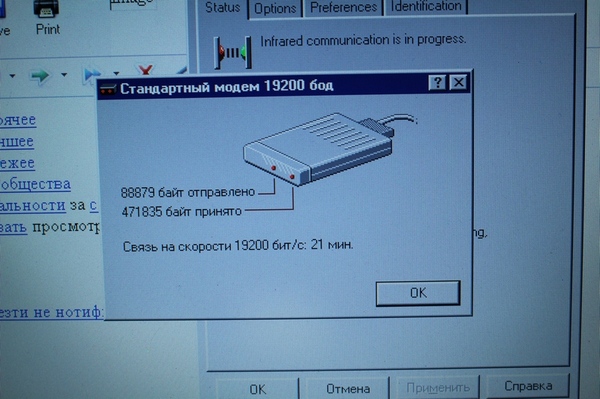 Накатываем на 95-ю винду обновление, которое позволяет коннектиться с мобилой по инфракрасному порту и знакомим оба девайса, фотографируя кривыми руками: