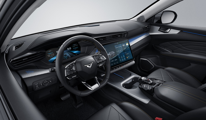 Интерьер оснащен подвесным центральным экраном и ЖК-прибором, а также хрустальной ручкой переключения передач с поддержкой CarLife и HiCar. Предлагаются пятиместная и семиместная компоновки.