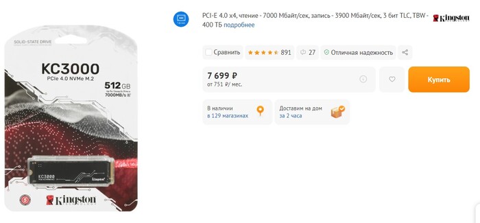 Присмотрел такой вариант, как Kingston KC3000, и цена адекватная, и по обзорам и отзывам говорят, замечательный накопитель. Капнула зарплата и на радостях пошёл заказывать. Посмотрел в ДНС и Озон, увидел, что на Озоне немного дешевле (да, ДНС очень любит накручивать ценник, не скроем этот факт), да и поставка полностью от него (никаких левых продавцов и прочее), ну и подумал, что сколько закупаюсь на Озоне, никогда проблем с ним не было.