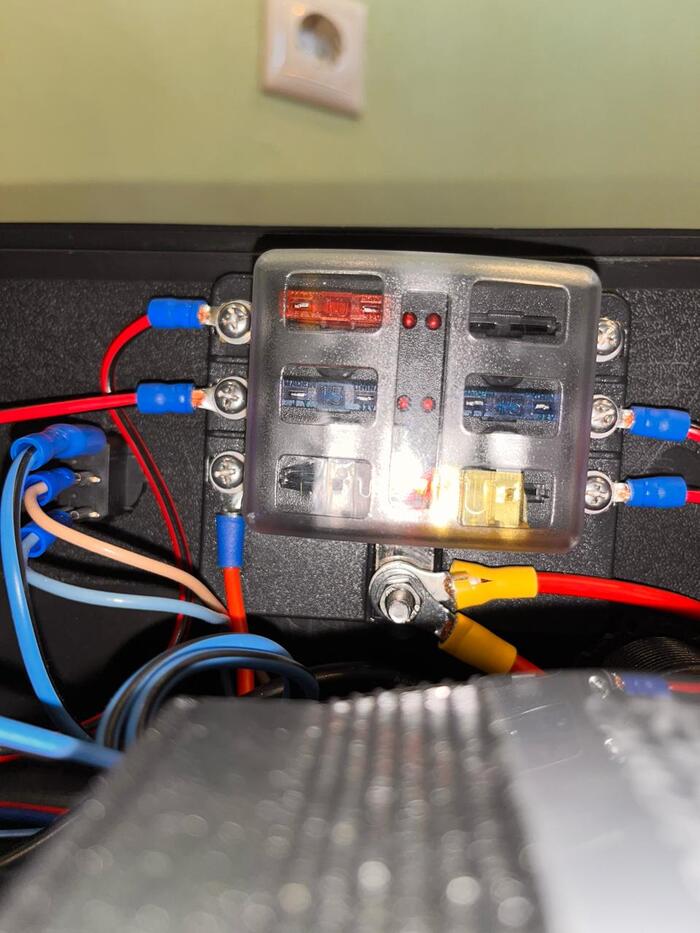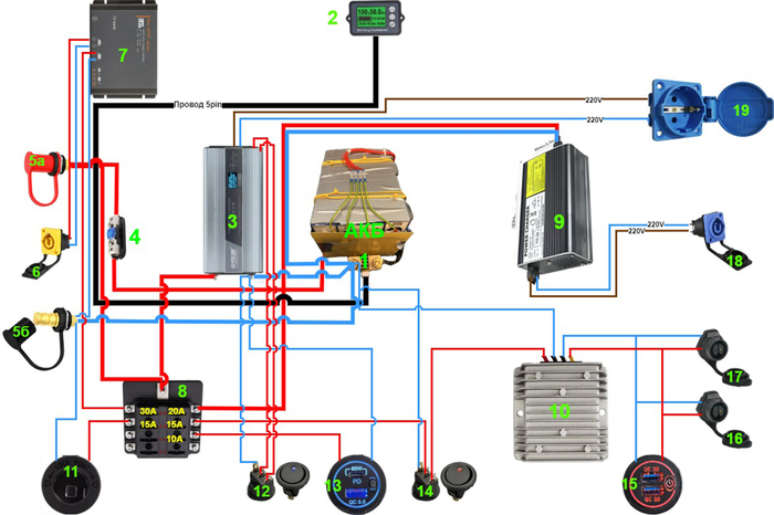 И уже через выносную клемму(5а) подключаем "плюс" к блоку предохранителей(8). Дальше уже "плюс" будем брать и подавать только на блок предохранителей(8). На схеме красные и синие провода отличаются толщиной, те что толще это провод ПВАМ 6,0мм2, те что тоньше это провод ПВАМ 2,5мм2. На 220в мы с вами уже повесили 1.5мм2. Оставшиеся две ветки провода 6мм2 брошены от блока предохранителей (8) к инвертору (3) и Зарядке(9).