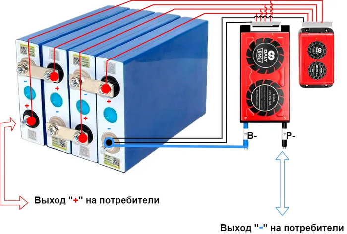 Сначала нарезаем стеклотекстолит по размеру ячеек и вставляем его между ними, чтобы при трении, если протрется изоляция ячеек они не замкнули. Далее затягиваем ячейки в скотч максимально плотно, предварительно правильно расставив последовательную полярность ячеек, т.е. если одна ячейка "плюсом" вверх значит следующая "плюсом" вниз и т.д. Закручиваем шпильки накидываем пластинки соединяя ячейки в последовательную цепь + к -. Достаем из коробки BMS( та что на схеме большая), активный балансир (тот что поменьше), комплектные провода на коннекторах. Не вставляя разъемы в BMS и балансир (ВАЖНО!!!) начинаем подключать по схеме. B- от BMS к "минусу" АКБ туда же два черных провода. Посмотрите на коннекторы от BMS и балансира и соблюдайте четкий порядок! Начиная от черного провода красные провода по очереди к каждому следующему "плюсу" от "минуса" АКБ. Всё проверяем и если норм, то подключаем коннекторы в разъемы BMS и балансира. BT подключайте в разъем BMS не в балансир. Далее крепим Daly BMS 4s 100A + умный балансир+ BT на бок АКБ удобным ( в пределах разумного) способом. У меня это металлические планки на которые вешают шкафы кухонные (завалялись)) которые я примотал к АКБ скотчем (не забываем про текстолит) и на болтики с гаечками повесил бмску и балансир, блютус приклеил тоже сбоку. Сторону с контактами АКБ тоже закрываем стеклотекстолитом, чтобы ничего случайно не коротнуло. Первый этап пройден. Можно подключить нагрузку или поставить на зарядку, а так же скачать оф приложение Daly и подключиться через BT к АКБ. Или пропустить это и скорее приступить к следующему этапу.