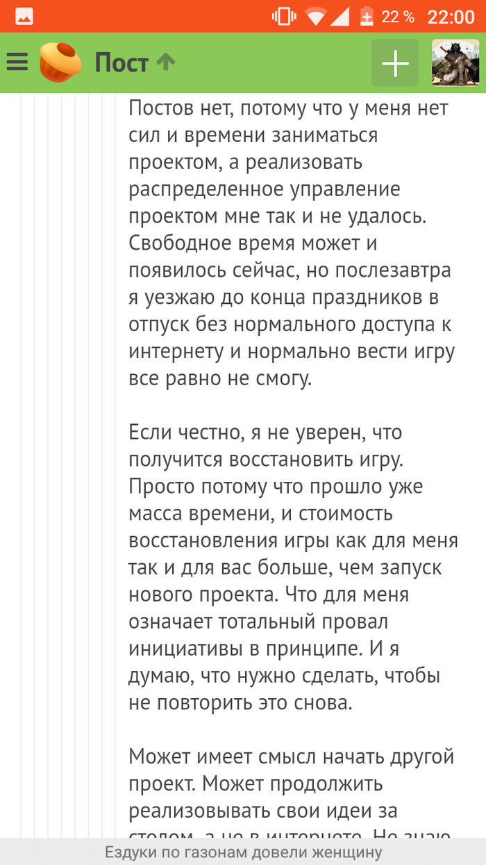 Это был очень амбициозный проект, полный хайпа и желаний сделать все круто, однако я как ГМ не справился с нагрузкой и, к сожалению, справедливо не оправдал ожиданий многих игроков. Проект оказался слишком большим для меня одного, и сломал меня буквально на первом ходу.