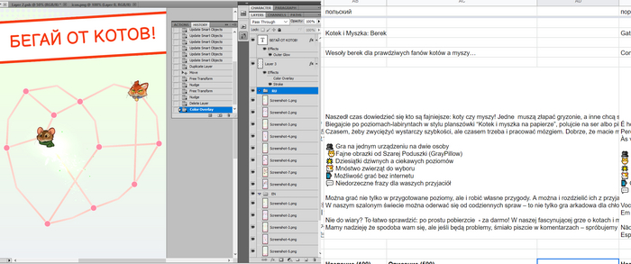 Ну и конечно, нужны тексты для описания самой игры в маркете. Название, короткое описание, полное описание, содержащее 100500 ключевых слов и 0 стоп-слов, промо тексты для скриншотов, которые кстати тоже надо подготовить...