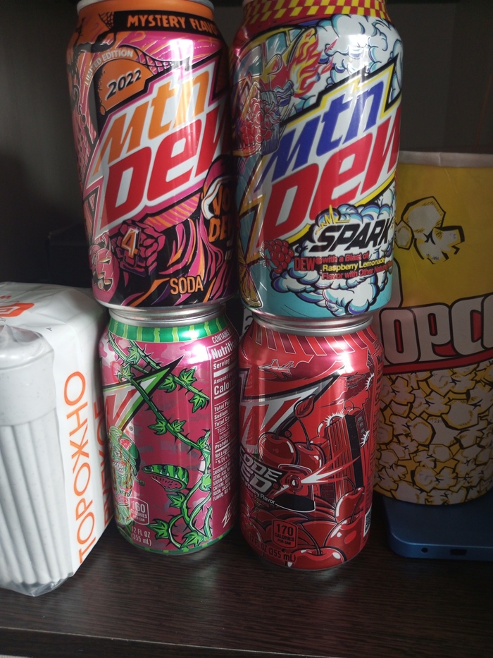 Куча разных вкусов, цветов и красивых баночек на картинках. Цена кусается, как и сейчас. 6 банок за 1200 - 2000р. Но это он! И вот началось моё знакомство с настоящим Mountain dew и его разнообразием вкусов. Буду пробовать, главное не переборщить с сахаром. Да, цены кусаются. Дорогое нынче удовольствие, главное, что у меня оно не так часто, но осталось.