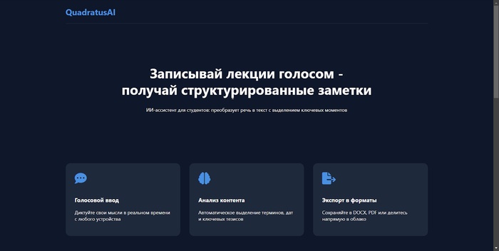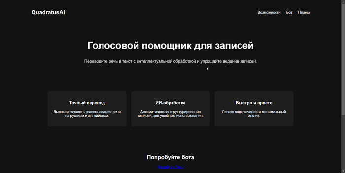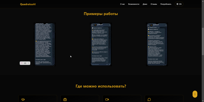 После создания рабочего Telegram-бота появилась идея подготовить демонстрационный сайт QuadratusAI.