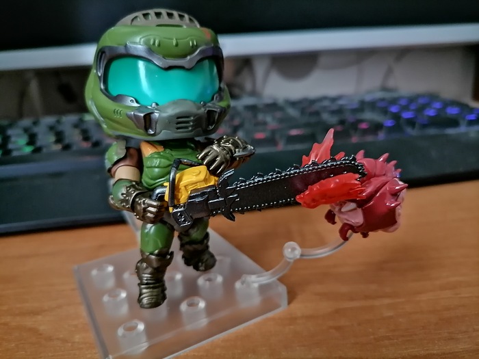 В комплекте шотган, наручный клинок, бензопила, пушка хищника и Горнило. Даже не знаешь, с каким оружием его на полку выставить.