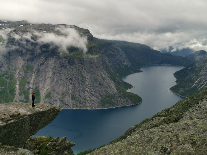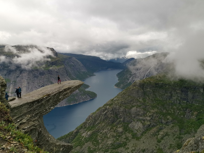 Оттуда, не задерживаясь сразу двинули в сторону Осло, но по пути всё таки заехали в Икею (Швеция же, ну) и у самой границы в тц, тупо купить всякой еды ибо в Норвегии цены прямо таки кусаются. Проскочив Осло уже ближе к вечеру, остановились ночевать в арендованном доме в деревне. Затем, всё также без остановок в сторону Одды - в пешее лазание по горам к Языку Тролля. А вот это оказалось самым жёстким хардкором. 16 км в одну сторону, горы, всё в облаках, морось, ничерта не видно, толпы китайцев, что оказалось для меня несравнимо сложнее, чем я предполагал - 16 км по городу легче раз 5. А по приходу на место - вот такой облом.