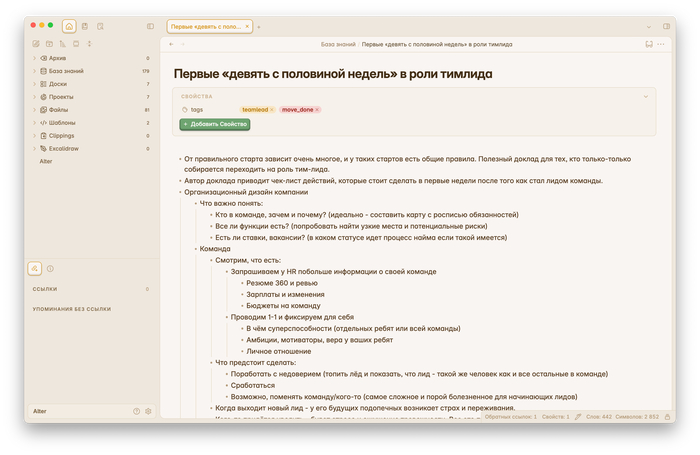 - Внутренние ссылки "[[имя заметки]]" для связей между темами