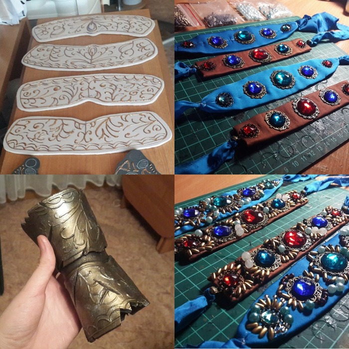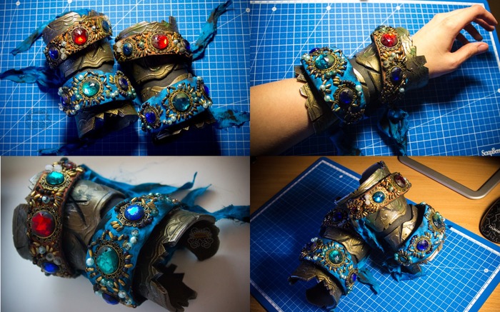 Косплей был начат ещё зимой 2018-го. Я очень люблю начинать с украшений и первым, что было сделано, были браслеты. Я решила сделать их в соответствии с официальным концепт-артом — там они выглядели гораздо интереснее, чем на модельке из игры:В качестве основного материала я использовала Eva-foam 3 мм и Баблстар. Узоры на браслетах — из контура по стеклу. Расшитые бусинами и стразами элементы крепились на проволоке, чтобы создать иллюзию их «полёта» над основой.