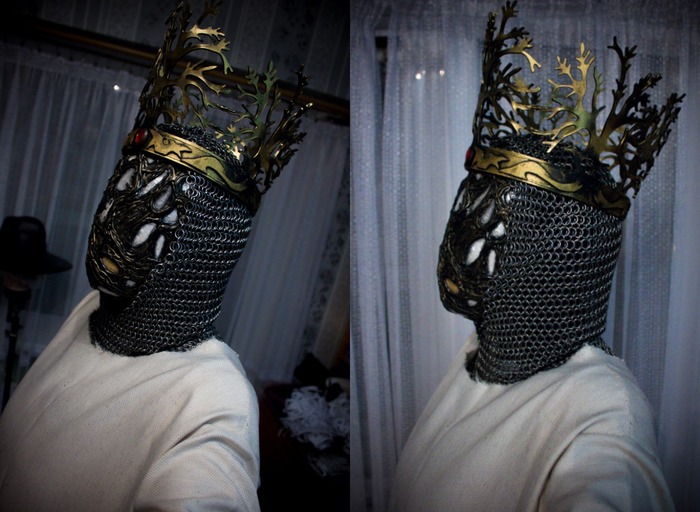 1. Настоящий кольчужный коиф (капюшон) весом 2,5 кг из стальных колец мне на заказ изготовил небезызвестный Иван Корж. Он сэкономил мне кучу времени — не подумайте, плести кольчугу я умею, просто делаю это крайне медленно.