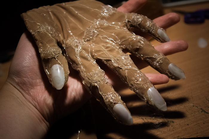 Расписывать её каждый раз на живую — не вариант, брать латекс — слишком дорого и сложно, поэтому банальные толстые колготки (ноги), бифлекс (руки), горячий клей и аэрограф — наше всё! Ну и накладные ноготочки, конечно же…