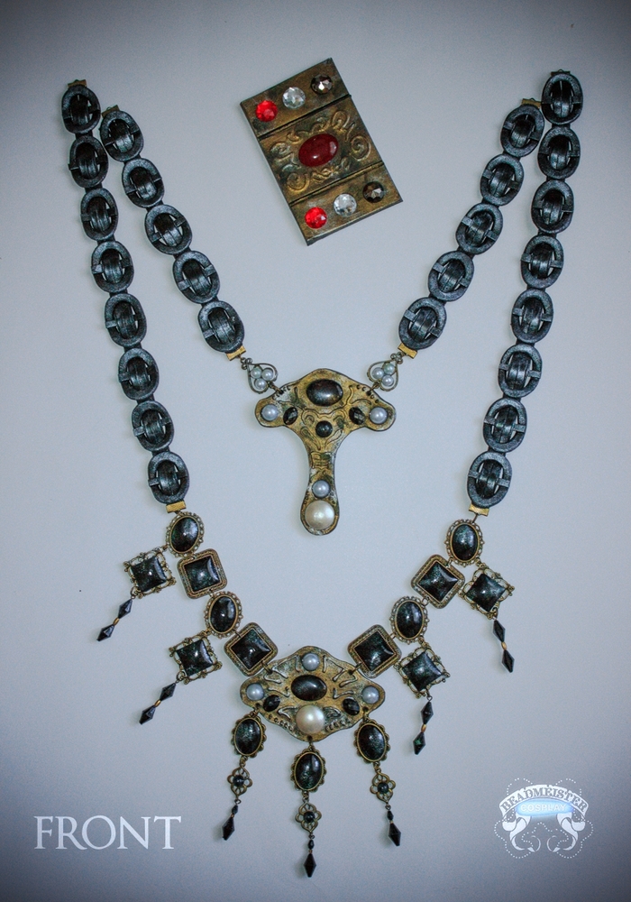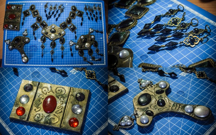 Стоит упомянуть, что вес всех украшений, кроме броши и верхнего ожерелья, из-за обилия стекла и металла, достиг почти 2 кг. Поэтому я придумала специальную систему креплений под платьем, на которую они цепляются через отверстия под шарфом.