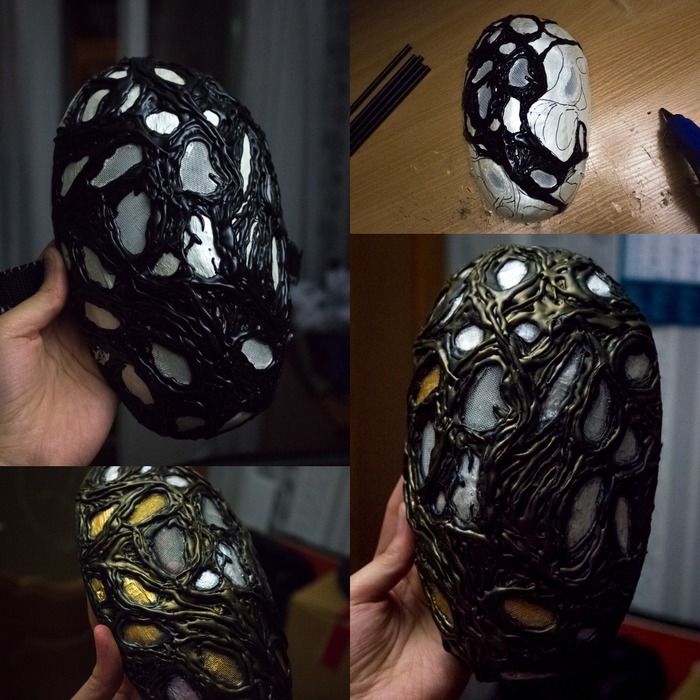 Далее — чёрный горячий клей для каноничной объемной текстуры (стержни чёрного цвета можно заказать на АлиЭкспресс), покраска, вставка сетки в отверстия на уровне глаз и рта (чтобы хоть что-то видеть и чем-то дышать :) ), крепления. Маска лёгкая и спокойно держится на липучках (сверху и по бокам) на балаклаве.