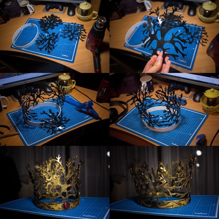 3. Нарезку веток для короны я заказала в местной конторе — вырезать их вручную было бы долго. Я нарисовала векторный узор, его подкорректировали и вырезали из чёрного полистирола 4 ветки, которые я впоследствии согнула строительным феном и соединила между собой и с основой короны из ПВХ.